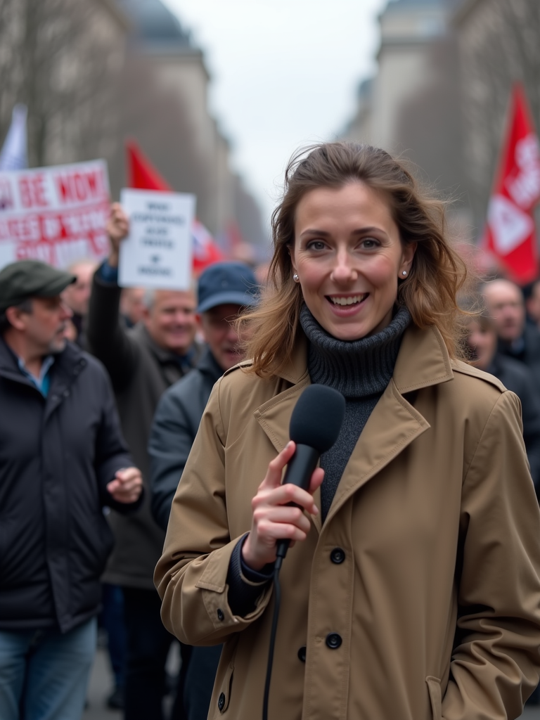a TV news channel-style field reporter wearing a windbreaker, holding a microphone, reporting from a chaotic protest scene. large crowds chant slogans like 'ban ai deepfakes!' and 'we want real news!' the chyron at the bottom reads: 'live: protests against PhotoAI.com.' in the background, people wave signs and hold banners saying 'who controls ai controls truth' and 'ai videos = ai lies.' the reporter interviews a protester who angrily says, 'ai-generated content is a tool for propaganda and job loss. we need regulation now!'