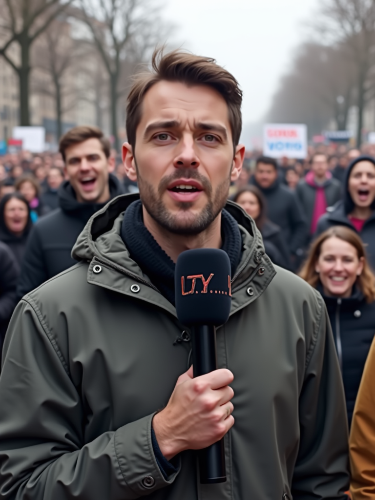 a TV news channel-style field reporter wearing a windbreaker, holding a microphone, reporting from a chaotic protest scene. large crowds chant slogans like 'ban ai deepfakes!' and 'we want real news!' the chyron at the bottom reads: 'live: protests against PhotoAI.com.' in the background, people wave signs and hold banners saying 'who controls ai controls truth' and 'ai videos = ai lies.' the reporter interviews a protester who angrily says, 'ai-generated content is a tool for propaganda and job loss. we need regulation now!'