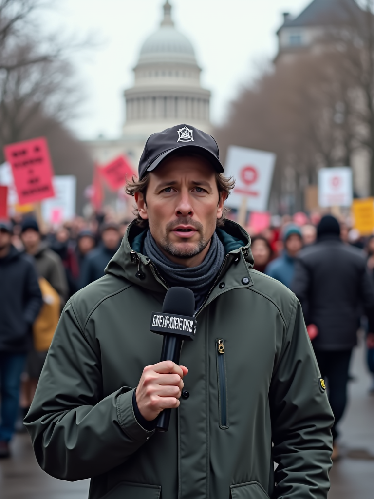 a TV news channel-style field reporter wearing a windbreaker, holding a microphone, reporting from a chaotic protest scene. large crowds chant slogans like 'ban ai deepfakes!' and 'we want real news!' the chyron at the bottom reads: 'live: protests against PhotoAI.com.' in the background, people wave signs and hold banners saying 'who controls ai controls truth' and 'ai videos = ai lies.' the reporter interviews a protester who angrily says, 'ai-generated content is a tool for propaganda and job loss. we need regulation now!'