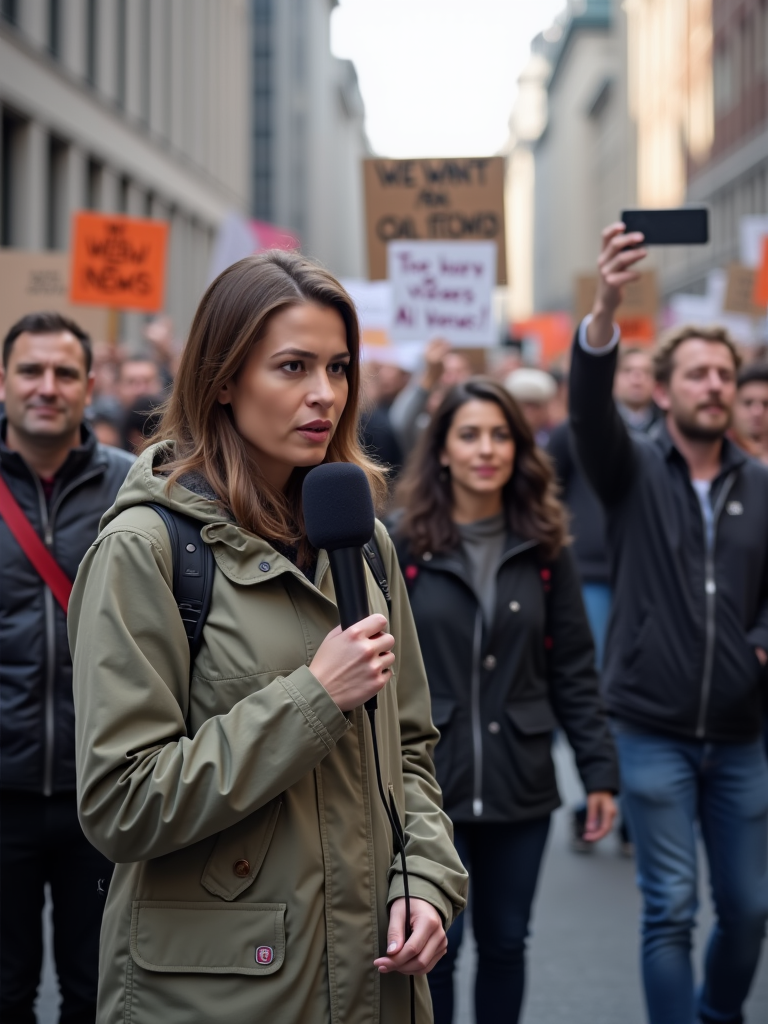 a TV news channel-style field reporter wearing a windbreaker, holding a microphone, reporting from a chaotic protest scene. large crowds chant slogans like 'ban ai deepfakes!' and 'we want real news!' the chyron at the bottom reads: 'live: protests against PhotoAI.com.' in the background, people wave signs and hold banners saying 'who controls ai controls truth' and 'ai videos = ai lies.' the reporter interviews a protester who angrily says, 'ai-generated content is a tool for propaganda and job loss. we need regulation now!'