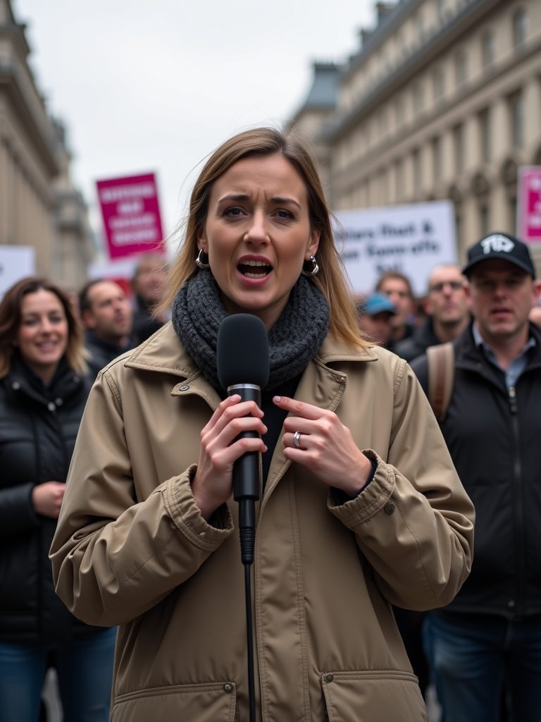 a TV news channel-style field reporter wearing a windbreaker, holding a microphone, reporting from a chaotic protest scene. large crowds chant slogans like 'ban ai deepfakes!' and 'we want real news!' the chyron at the bottom reads: 'live: protests against PhotoAI.com.' in the background, people wave signs and hold banners saying 'who controls ai controls truth' and 'ai videos = ai lies.' the reporter interviews a protester who angrily says, 'ai-generated content is a tool for propaganda and job loss. we need regulation now!'