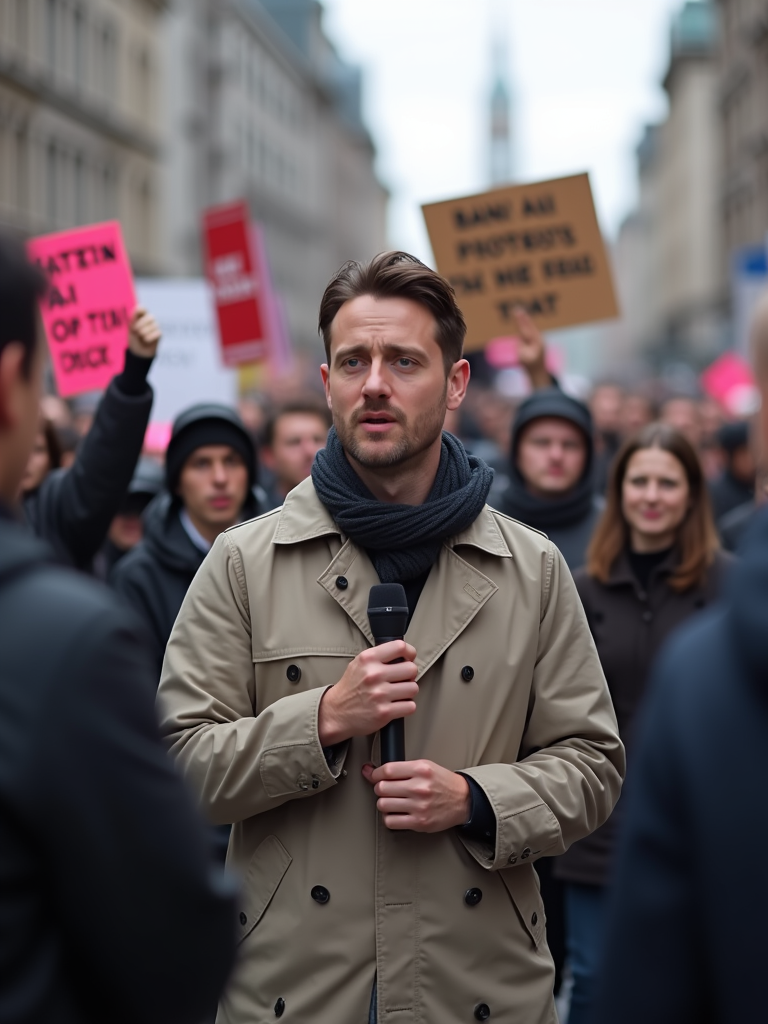 a TV news channel-style field reporter wearing a windbreaker, holding a microphone, reporting from a chaotic protest scene. large crowds chant slogans like 'ban ai deepfakes!' and 'we want real news!' the chyron at the bottom reads: 'live: protests against PhotoAI.com.' in the background, people wave signs and hold banners saying 'who controls ai controls truth' and 'ai videos = ai lies.' the reporter interviews a protester who angrily says, 'ai-generated content is a tool for propaganda and job loss. we need regulation now!'