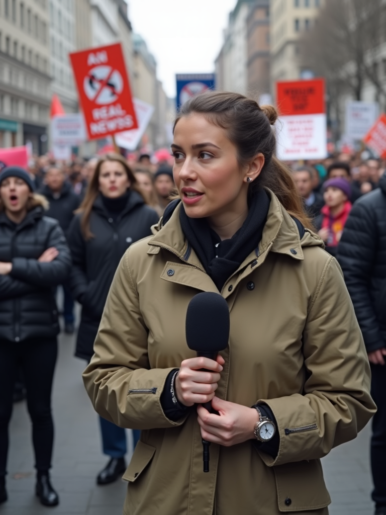 a TV news channel-style field reporter wearing a windbreaker, holding a microphone, reporting from a chaotic protest scene. large crowds chant slogans like 'ban ai deepfakes!' and 'we want real news!' the chyron at the bottom reads: 'live: protests against PhotoAI.com.' in the background, people wave signs and hold banners saying 'who controls ai controls truth' and 'ai videos = ai lies.' the reporter interviews a protester who angrily says, 'ai-generated content is a tool for propaganda and job loss. we need regulation now!'