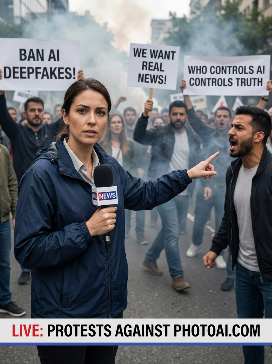 a TV news channel-style field reporter wearing a windbreaker, holding a microphone, reporting from a chaotic protest scene. large crowds chant slogans like 'ban ai deepfakes!' and 'we want real news!' the chyron at the bottom reads: 'live: protests against PhotoAI.com.' in the background, people wave signs and hold banners saying 'who controls ai controls truth' and 'ai videos = ai lies.' the reporter interviews a protester who angrily says, 'ai-generated content is a tool for propaganda and job loss. we need regulation now!'