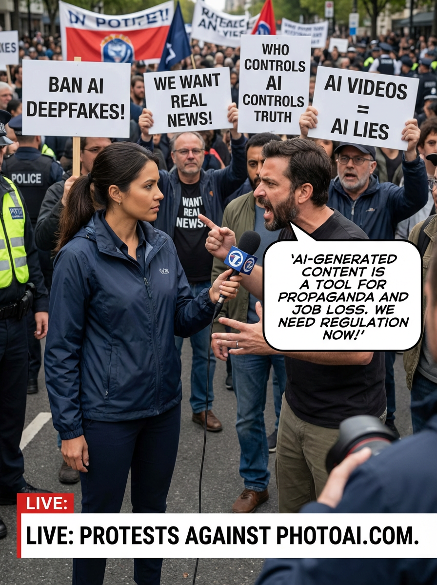 a TV news channel-style field reporter wearing a windbreaker, holding a microphone, reporting from a chaotic protest scene. large crowds chant slogans like 'ban ai deepfakes!' and 'we want real news!' the chyron at the bottom reads: 'live: protests against PhotoAI.com.' in the background, people wave signs and hold banners saying 'who controls ai controls truth' and 'ai videos = ai lies.' the reporter interviews a protester who angrily says, 'ai-generated content is a tool for propaganda and job loss. we need regulation now!'