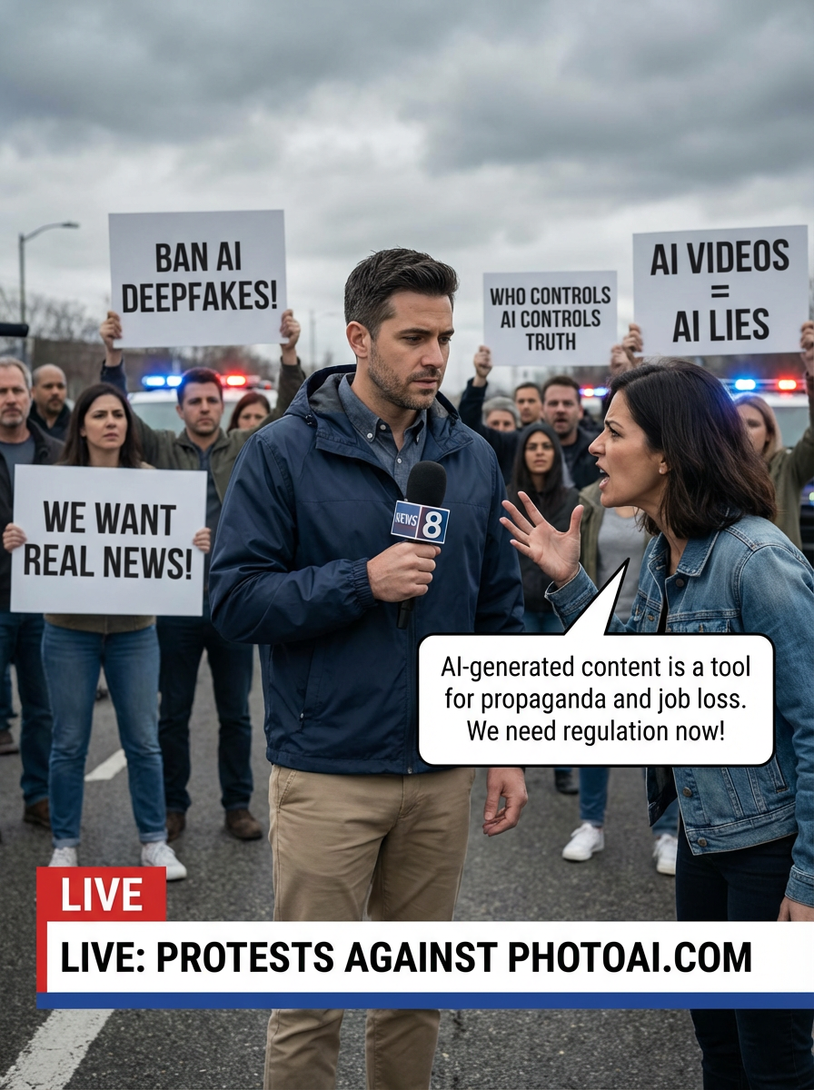 a TV news channel-style field reporter wearing a windbreaker, holding a microphone, reporting from a chaotic protest scene. large crowds chant slogans like 'ban ai deepfakes!' and 'we want real news!' the chyron at the bottom reads: 'live: protests against PhotoAI.com.' in the background, people wave signs and hold banners saying 'who controls ai controls truth' and 'ai videos = ai lies.' the reporter interviews a protester who angrily says, 'ai-generated content is a tool for propaganda and job loss. we need regulation now!'