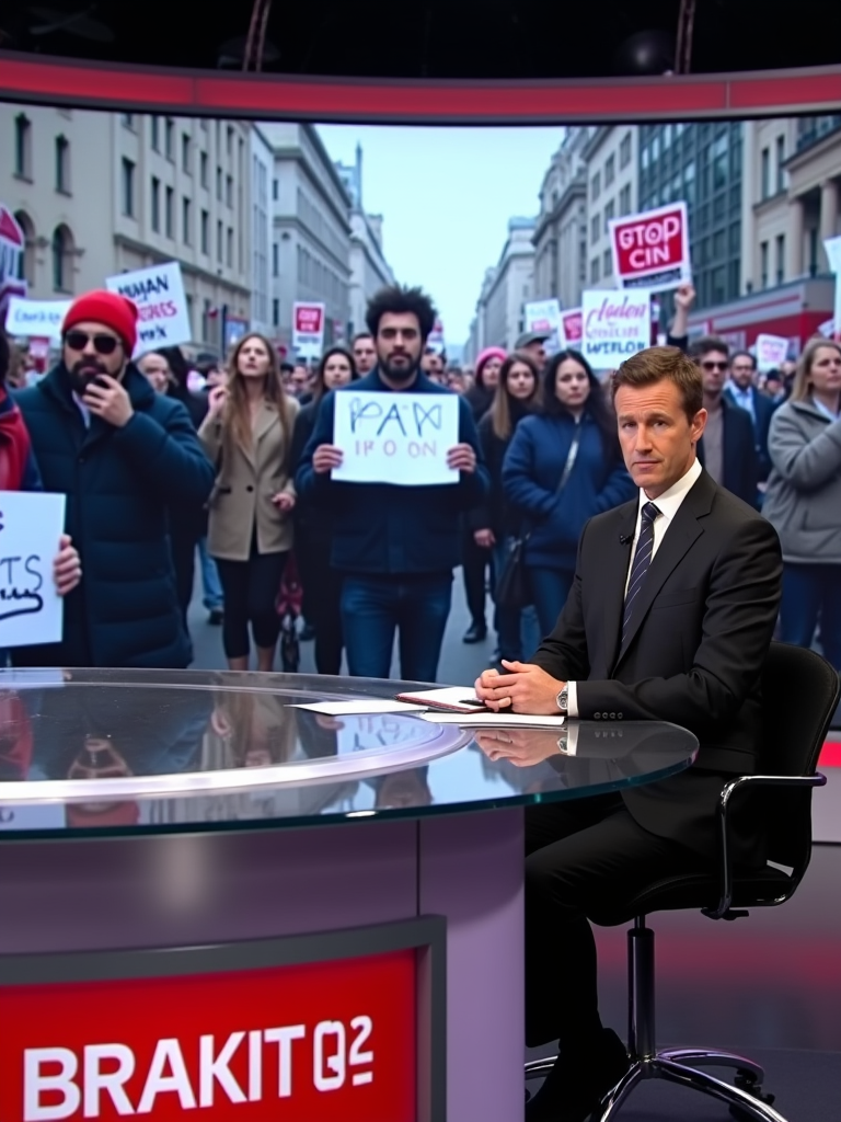 a TV news channel-style newsroom. a serious-looking news anchor sits at a modern news desk with 'breaking news' displayed on the screen. the chyron reads: 'protests erupt against PhotoAI.com.' behind the anchor, a large screen shows live footage of protesters in a major city like new york, london, or berlin. protesters hold signs such as 'stop ai lies,' 'human creators matter,' and 'real content, real people.' the news ticker below mentions concerns over ai deepfakes, job losses in the entertainment industry, and the rise of ai misinformation. the anchor introduces a live reporter on the ground at the protest.
