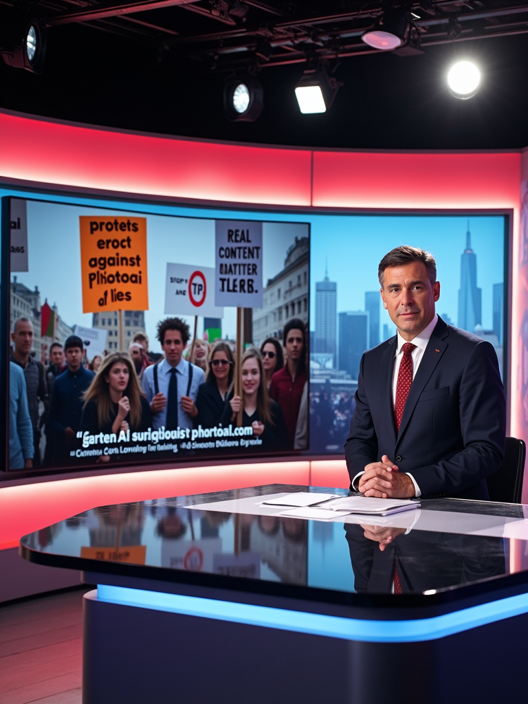 a TV news channel-style newsroom. a serious-looking news anchor sits at a modern news desk with 'breaking news' displayed on the screen. the chyron reads: 'protests erupt against PhotoAI.com.' behind the anchor, a large screen shows live footage of protesters in a major city like new york, london, or berlin. protesters hold signs such as 'stop ai lies,' 'human creators matter,' and 'real content, real people.' the news ticker below mentions concerns over ai deepfakes, job losses in the entertainment industry, and the rise of ai misinformation. the anchor introduces a live reporter on the ground at the protest.