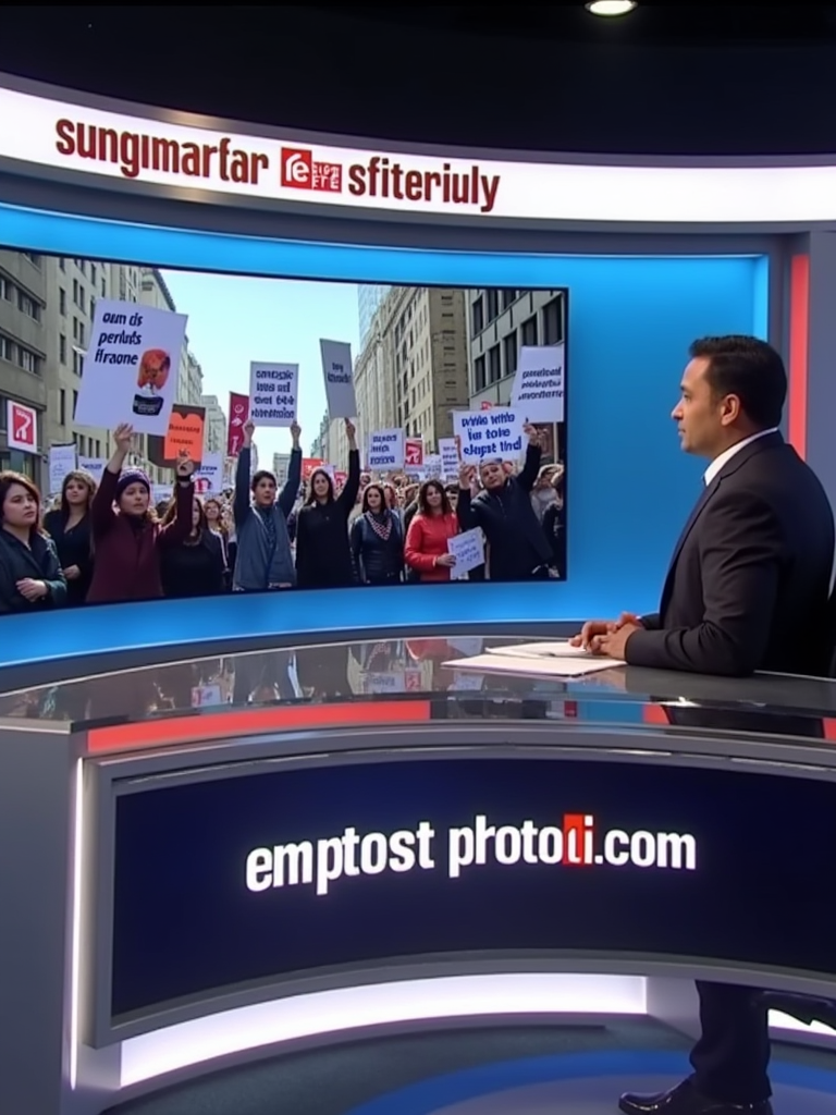 a TV news channel-style newsroom. a serious-looking news anchor sits at a modern news desk with 'breaking news' displayed on the screen. the chyron reads: 'protests erupt against PhotoAI.com.' behind the anchor, a large screen shows live footage of protesters in a major city like new york, london, or berlin. protesters hold signs such as 'stop ai lies,' 'human creators matter,' and 'real content, real people.' the news ticker below mentions concerns over ai deepfakes, job losses in the entertainment industry, and the rise of ai misinformation. the anchor introduces a live reporter on the ground at the protest.
