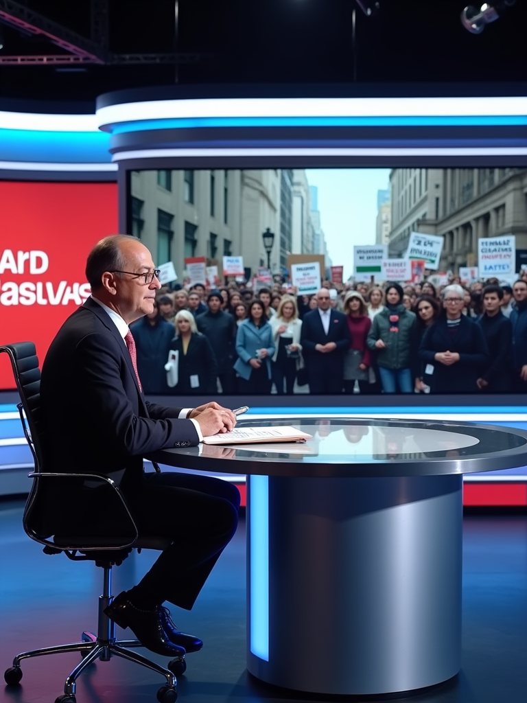 a TV news channel-style newsroom. a serious-looking news anchor sits at a modern news desk with 'breaking news' displayed on the screen. the chyron reads: 'protests erupt against PhotoAI.com.' behind the anchor, a large screen shows live footage of protesters in a major city like new york, london, or berlin. protesters hold signs such as 'stop ai lies,' 'human creators matter,' and 'real content, real people.' the news ticker below mentions concerns over ai deepfakes, job losses in the entertainment industry, and the rise of ai misinformation. the anchor introduces a live reporter on the ground at the protest.