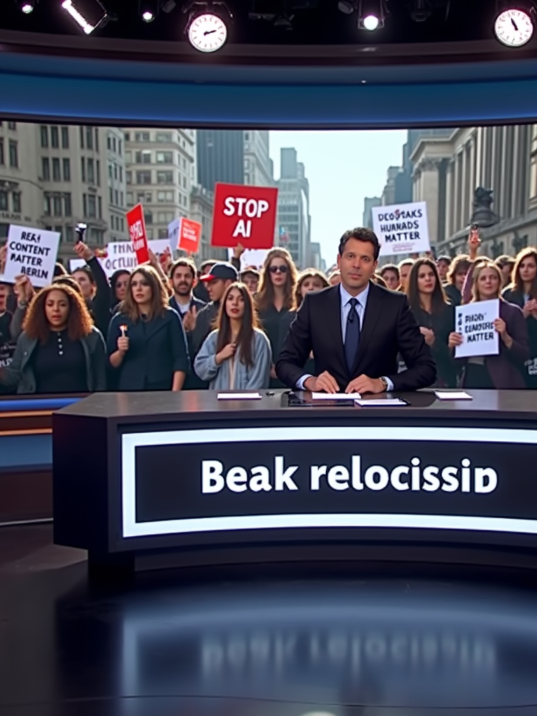 a TV news channel-style newsroom. a serious-looking news anchor sits at a modern news desk with 'breaking news' displayed on the screen. the chyron reads: 'protests erupt against PhotoAI.com.' behind the anchor, a large screen shows live footage of protesters in a major city like new york, london, or berlin. protesters hold signs such as 'stop ai lies,' 'human creators matter,' and 'real content, real people.' the news ticker below mentions concerns over ai deepfakes, job losses in the entertainment industry, and the rise of ai misinformation. the anchor introduces a live reporter on the ground at the protest.