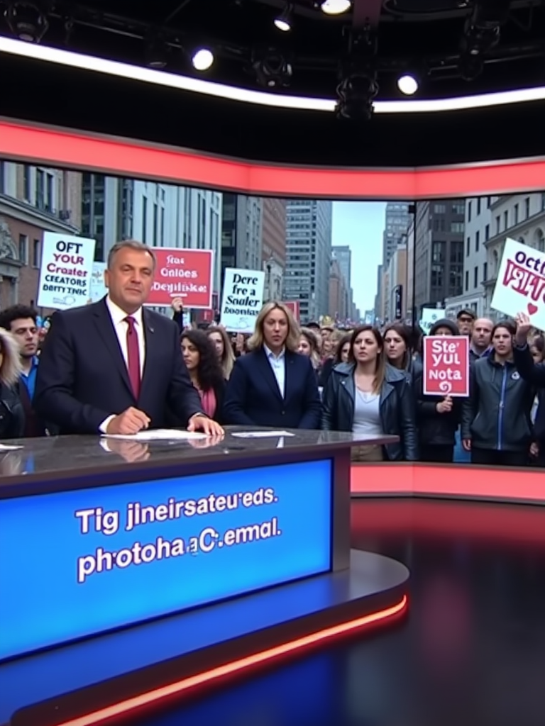 a TV news channel-style newsroom. a serious-looking news anchor sits at a modern news desk with 'breaking news' displayed on the screen. the chyron reads: 'protests erupt against PhotoAI.com.' behind the anchor, a large screen shows live footage of protesters in a major city like new york, london, or berlin. protesters hold signs such as 'stop ai lies,' 'human creators matter,' and 'real content, real people.' the news ticker below mentions concerns over ai deepfakes, job losses in the entertainment industry, and the rise of ai misinformation. the anchor introduces a live reporter on the ground at the protest.