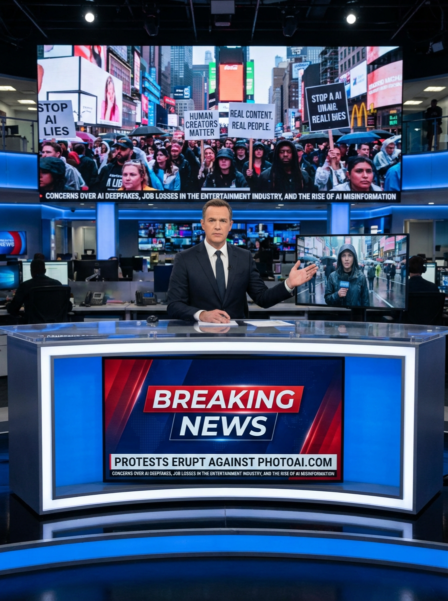 a TV news channel-style newsroom. a serious-looking news anchor sits at a modern news desk with 'breaking news' displayed on the screen. the chyron reads: 'protests erupt against PhotoAI.com.' behind the anchor, a large screen shows live footage of protesters in a major city like new york, london, or berlin. protesters hold signs such as 'stop ai lies,' 'human creators matter,' and 'real content, real people.' the news ticker below mentions concerns over ai deepfakes, job losses in the entertainment industry, and the rise of ai misinformation. the anchor introduces a live reporter on the ground at the protest.