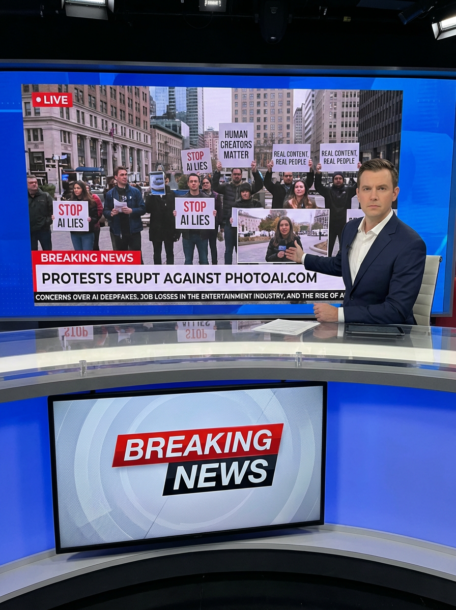a TV news channel-style newsroom. a serious-looking news anchor sits at a modern news desk with 'breaking news' displayed on the screen. the chyron reads: 'protests erupt against PhotoAI.com.' behind the anchor, a large screen shows live footage of protesters in a major city like new york, london, or berlin. protesters hold signs such as 'stop ai lies,' 'human creators matter,' and 'real content, real people.' the news ticker below mentions concerns over ai deepfakes, job losses in the entertainment industry, and the rise of ai misinformation. the anchor introduces a live reporter on the ground at the protest.
