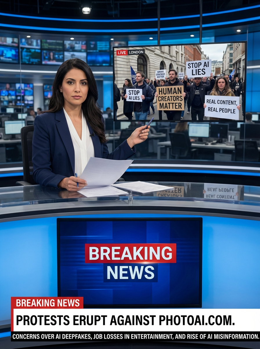 a TV news channel-style newsroom. a serious-looking news anchor sits at a modern news desk with 'breaking news' displayed on the screen. the chyron reads: 'protests erupt against PhotoAI.com.' behind the anchor, a large screen shows live footage of protesters in a major city like new york, london, or berlin. protesters hold signs such as 'stop ai lies,' 'human creators matter,' and 'real content, real people.' the news ticker below mentions concerns over ai deepfakes, job losses in the entertainment industry, and the rise of ai misinformation. the anchor introduces a live reporter on the ground at the protest.