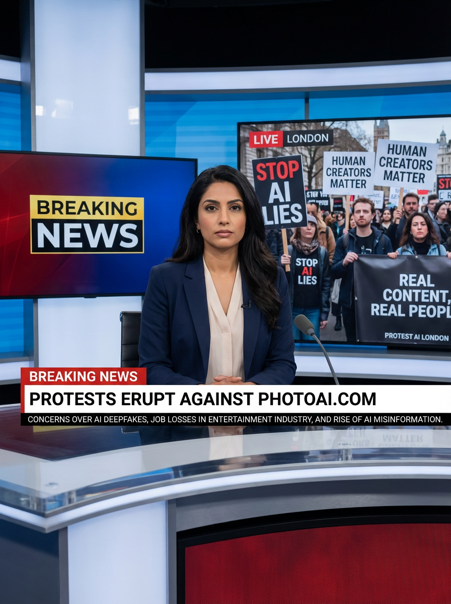 a TV news channel-style newsroom. a serious-looking news anchor sits at a modern news desk with 'breaking news' displayed on the screen. the chyron reads: 'protests erupt against PhotoAI.com.' behind the anchor, a large screen shows live footage of protesters in a major city like new york, london, or berlin. protesters hold signs such as 'stop ai lies,' 'human creators matter,' and 'real content, real people.' the news ticker below mentions concerns over ai deepfakes, job losses in the entertainment industry, and the rise of ai misinformation. the anchor introduces a live reporter on the ground at the protest.