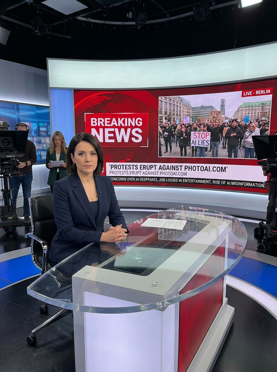 a TV news channel-style newsroom. a serious-looking news anchor sits at a modern news desk with 'breaking news' displayed on the screen. the chyron reads: 'protests erupt against PhotoAI.com.' behind the anchor, a large screen shows live footage of protesters in a major city like new york, london, or berlin. protesters hold signs such as 'stop ai lies,' 'human creators matter,' and 'real content, real people.' the news ticker below mentions concerns over ai deepfakes, job losses in the entertainment industry, and the rise of ai misinformation. the anchor introduces a live reporter on the ground at the protest.