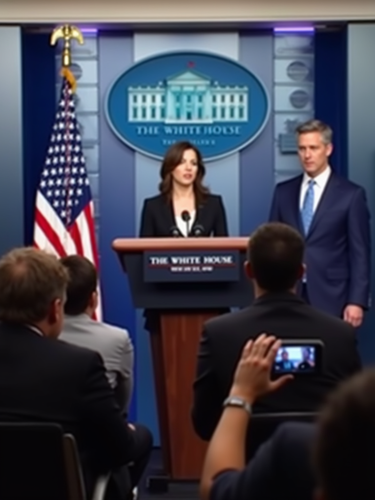 a u.s. government press briefing with a white house spokesperson addressing concerns about ai-generated videos. the chyron reads: 'white house responds to PhotoAI.com backlash.' the spokesperson says, 'we take the threat of ai misinformation seriously and are evaluating new regulations.' journalists in the audience hold microphones, asking tough questions about ai censorship and free speech.