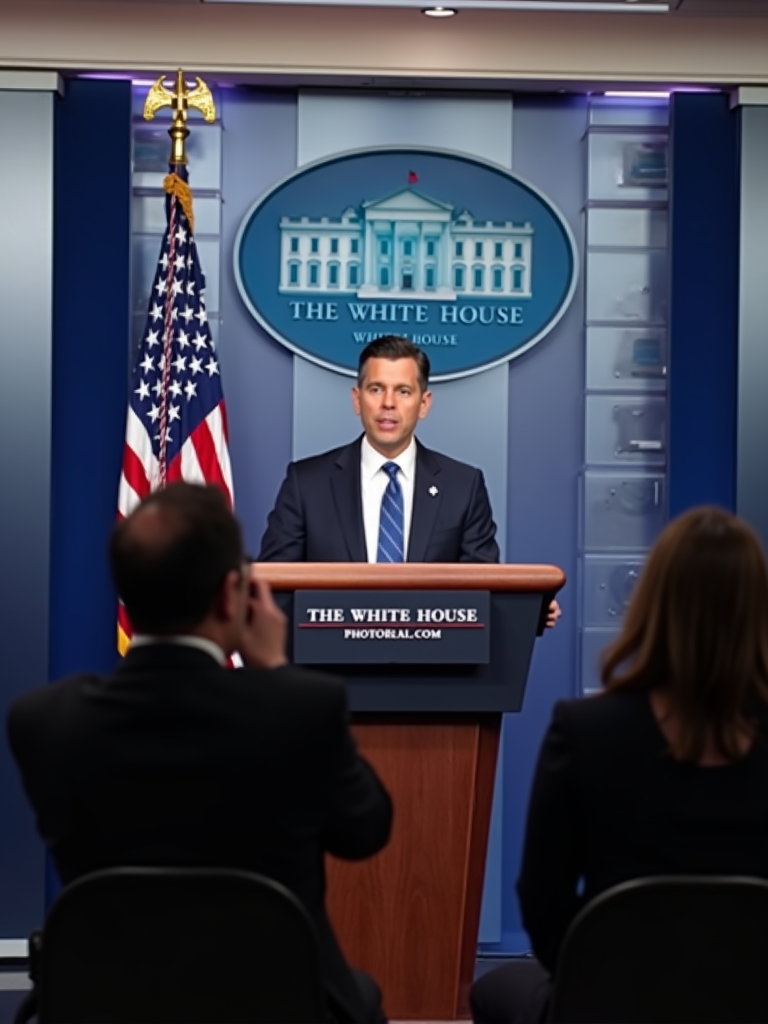 a u.s. government press briefing with a white house spokesperson addressing concerns about ai-generated videos. the chyron reads: 'white house responds to PhotoAI.com backlash.' the spokesperson says, 'we take the threat of ai misinformation seriously and are evaluating new regulations.' journalists in the audience hold microphones, asking tough questions about ai censorship and free speech.