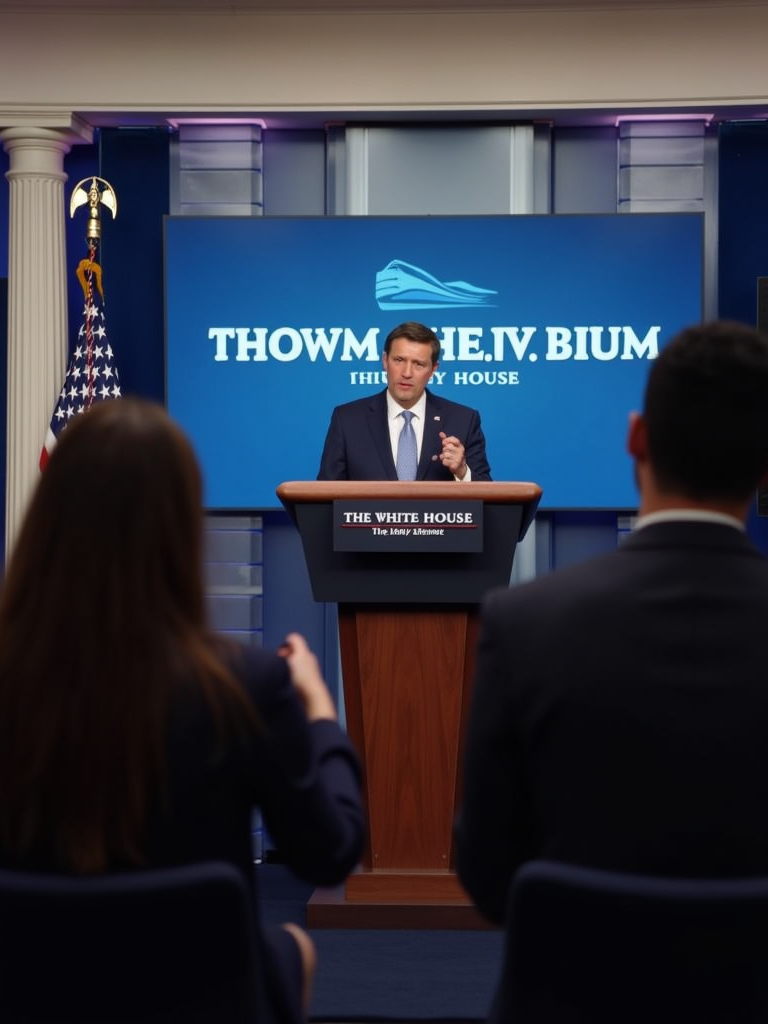 a u.s. government press briefing with a white house spokesperson addressing concerns about ai-generated videos. the chyron reads: 'white house responds to PhotoAI.com backlash.' the spokesperson says, 'we take the threat of ai misinformation seriously and are evaluating new regulations.' journalists in the audience hold microphones, asking tough questions about ai censorship and free speech.