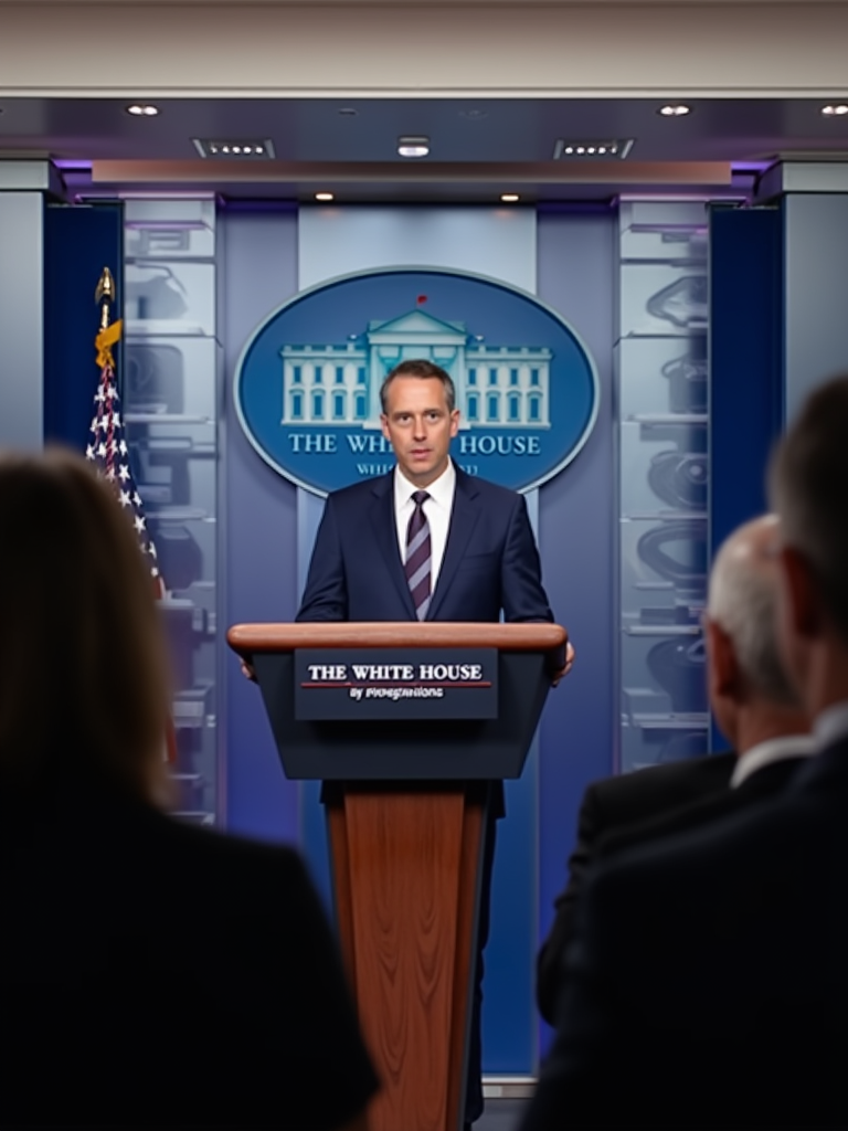 a u.s. government press briefing with a white house spokesperson addressing concerns about ai-generated videos. the chyron reads: 'white house responds to PhotoAI.com backlash.' the spokesperson says, 'we take the threat of ai misinformation seriously and are evaluating new regulations.' journalists in the audience hold microphones, asking tough questions about ai censorship and free speech.