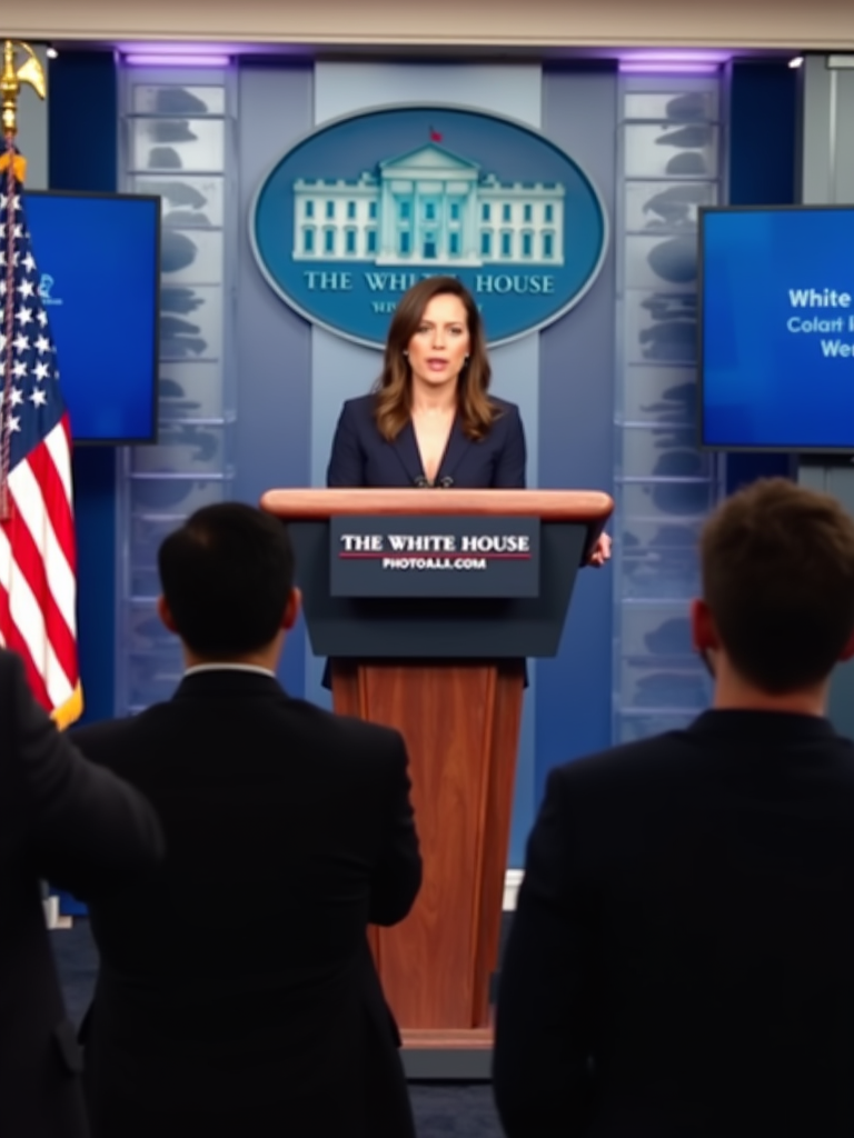 a u.s. government press briefing with a white house spokesperson addressing concerns about ai-generated videos. the chyron reads: 'white house responds to PhotoAI.com backlash.' the spokesperson says, 'we take the threat of ai misinformation seriously and are evaluating new regulations.' journalists in the audience hold microphones, asking tough questions about ai censorship and free speech.