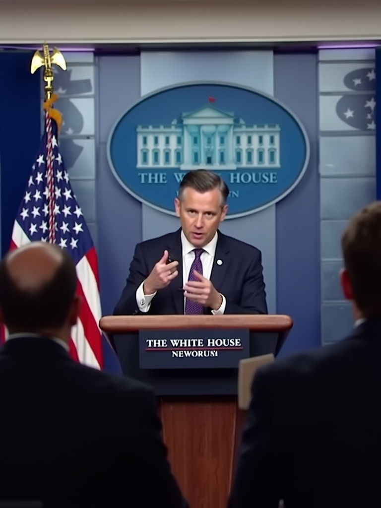 a u.s. government press briefing with a white house spokesperson addressing concerns about ai-generated videos. the chyron reads: 'white house responds to PhotoAI.com backlash.' the spokesperson says, 'we take the threat of ai misinformation seriously and are evaluating new regulations.' journalists in the audience hold microphones, asking tough questions about ai censorship and free speech.