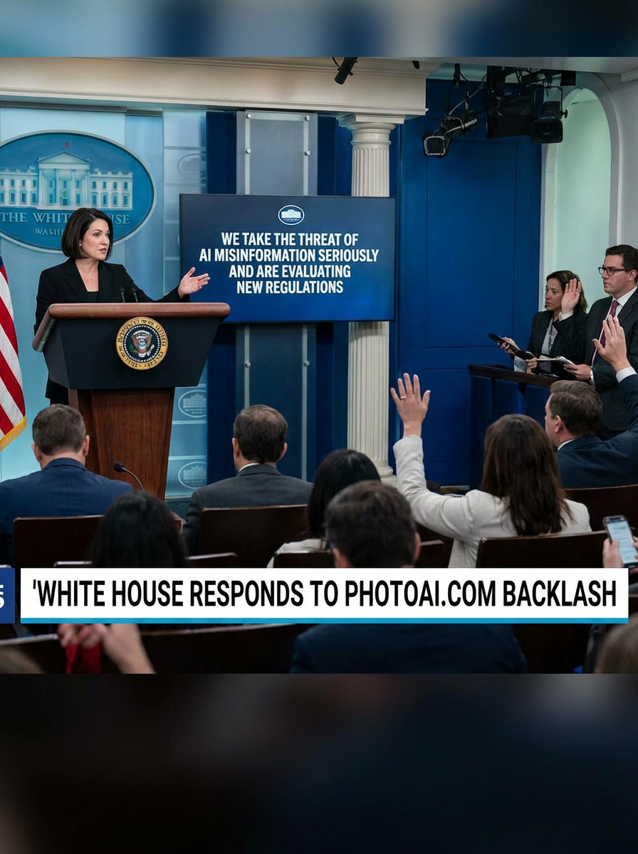 a u.s. government press briefing with a white house spokesperson addressing concerns about ai-generated videos. the chyron reads: 'white house responds to PhotoAI.com backlash.' the spokesperson says, 'we take the threat of ai misinformation seriously and are evaluating new regulations.' journalists in the audience hold microphones, asking tough questions about ai censorship and free speech.