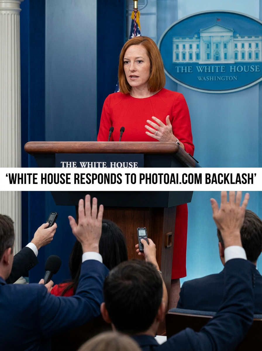 a u.s. government press briefing with a white house spokesperson addressing concerns about ai-generated videos. the chyron reads: 'white house responds to PhotoAI.com backlash.' the spokesperson says, 'we take the threat of ai misinformation seriously and are evaluating new regulations.' journalists in the audience hold microphones, asking tough questions about ai censorship and free speech.