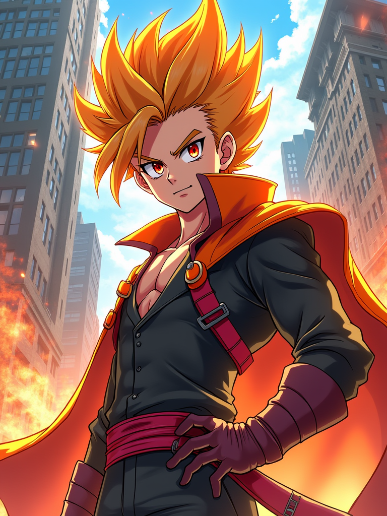 A vibrant anime-style avatar of a determined shonen protagonist, wearing a heroic outfit with spiky hair and a fiery determined look. The background features an action-packed anime cityscape with dynamic lighting. the style is in anime illustration.