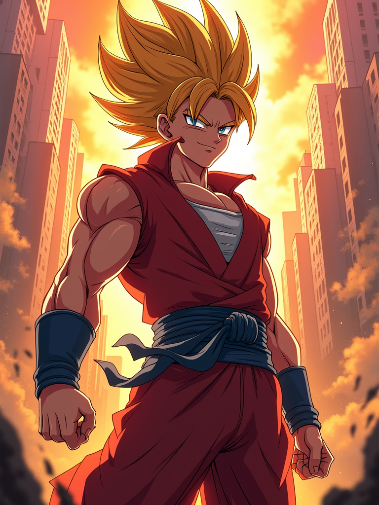 A vibrant anime-style avatar of a determined shonen protagonist, wearing a heroic outfit with spiky hair and a fiery determined look. The background features an action-packed anime cityscape with dynamic lighting. the style is in anime illustration.