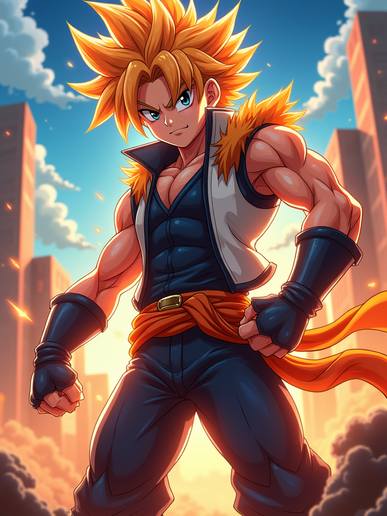 A vibrant anime-style avatar of a determined shonen protagonist, wearing a heroic outfit with spiky hair and a fiery determined look. The background features an action-packed anime cityscape with dynamic lighting. the style is in anime illustration.