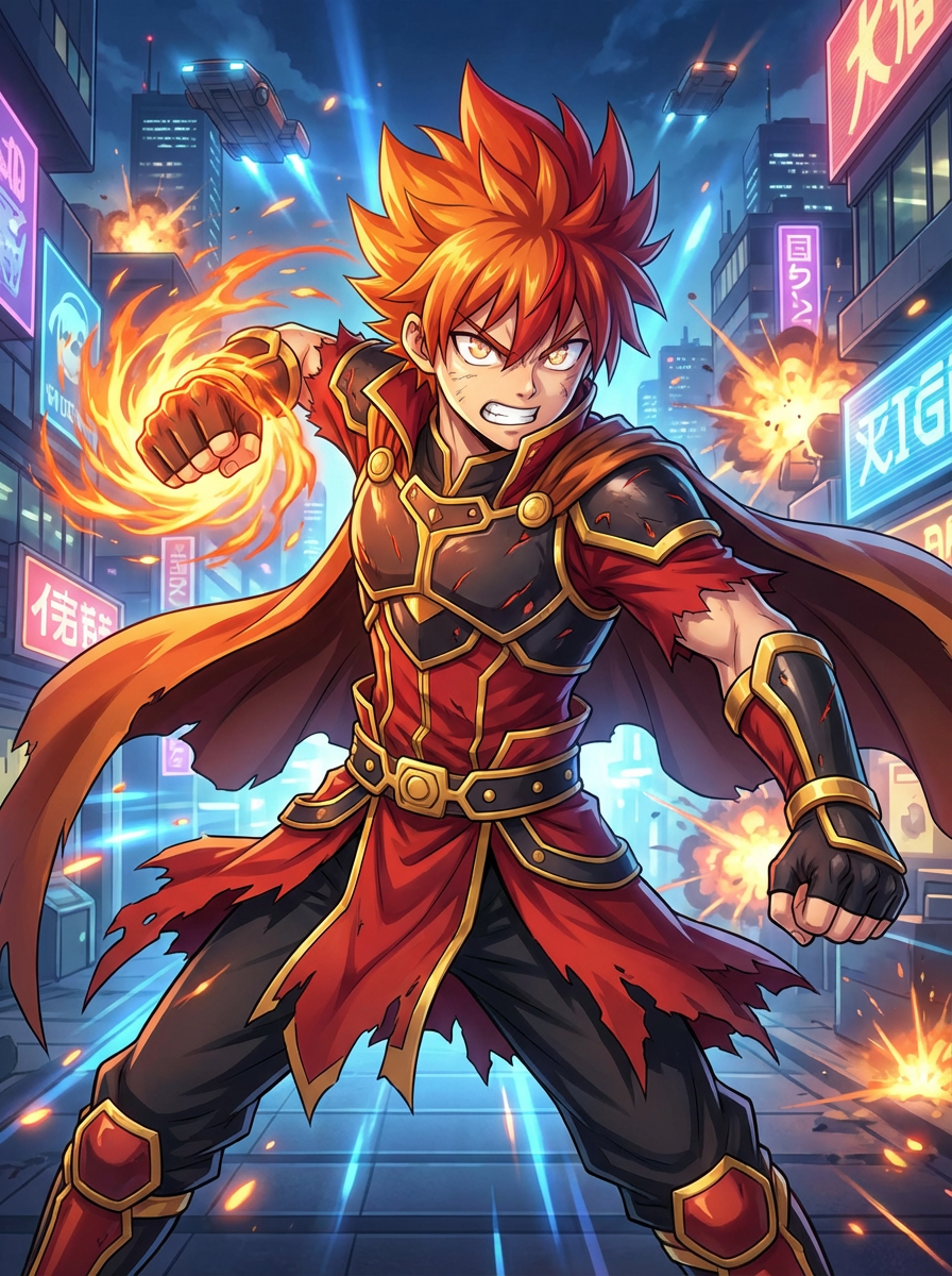 A vibrant anime-style avatar of a determined shonen protagonist, wearing a heroic outfit with spiky hair and a fiery determined look. The background features an action-packed anime cityscape with dynamic lighting. the style is in anime illustration.