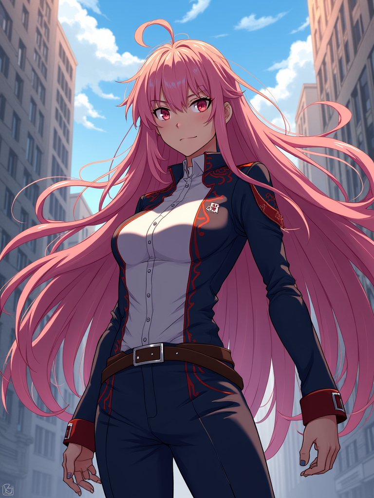 A vibrant anime-style avatar of a determined shonen protagonist, wearing a sleek battle uniform with long flowing hair and a confident expression . The background features an action-packed anime cityscape with dynamic lighting. the style is in anime illustration.