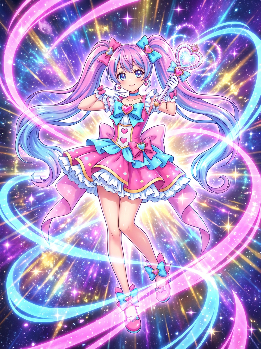 A vibrant anime-style illustration of a magical girl mid-transformation, surrounded by glowing energy ribbons and sparkling effects. She wears a colorful frilly magical girl outfit with a heart-shaped wand and flowing twin-tails . The background radiates cosmic energy with a dazzling burst of colors. The style is in anime illustration.
