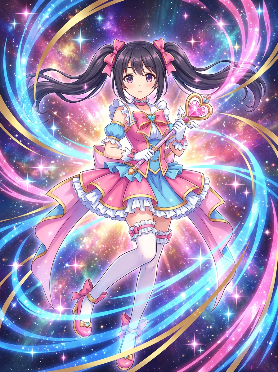 A vibrant anime-style illustration of a magical girl mid-transformation, surrounded by glowing energy ribbons and sparkling effects. She wears a colorful frilly magical girl outfit with a heart-shaped wand and flowing twin-tails . The background radiates cosmic energy with a dazzling burst of colors. The style is in anime illustration.