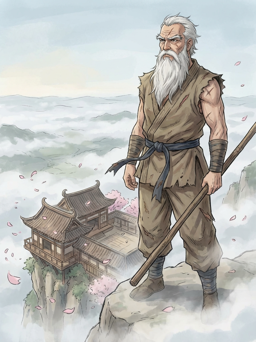 A wise, battle-hardened anime master standing atop a misty mountain, overlooking the world below. The model wears a rugged old master's gi with a long flowing beard and piercing eyes. The backdrop is an ancient dojo perched on a cliff, with floating petals caught in the wind. The style is in anime illustration.