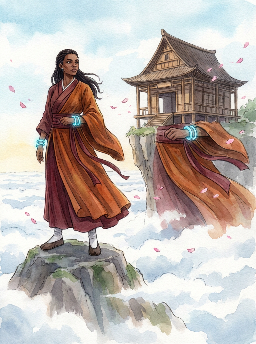 A wise, battle-hardened anime master standing atop a misty mountain, overlooking the world below. The model wears a flowing monk's robe with glowing enchanted bracelets . The backdrop is an ancient dojo perched on a cliff, with floating petals caught in the wind. The style is in anime illustration.