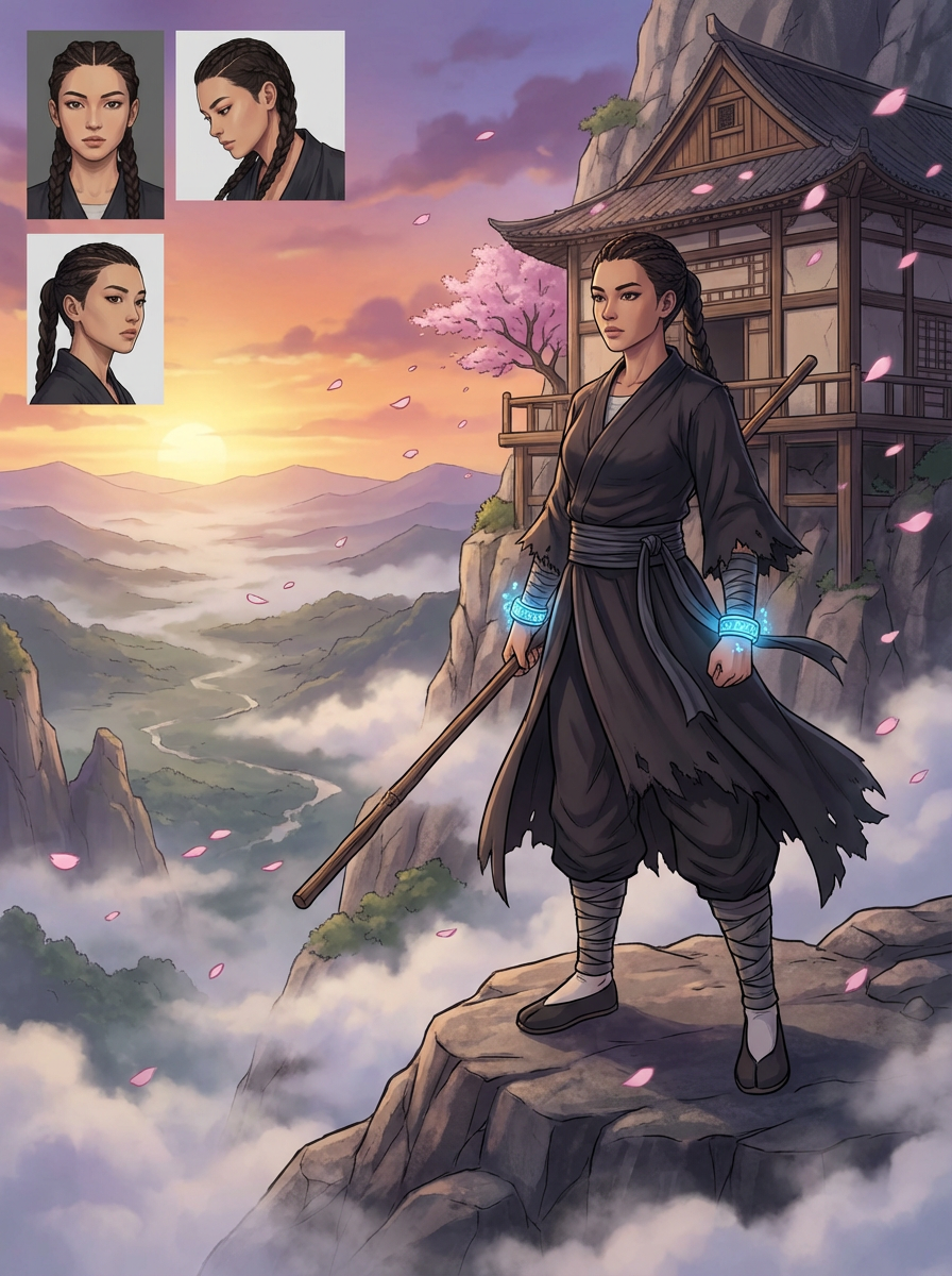 A wise, battle-hardened anime master standing atop a misty mountain, overlooking the world below. The model wears a flowing monk's robe with glowing enchanted bracelets . The backdrop is an ancient dojo perched on a cliff, with floating petals caught in the wind. The style is in anime illustration.