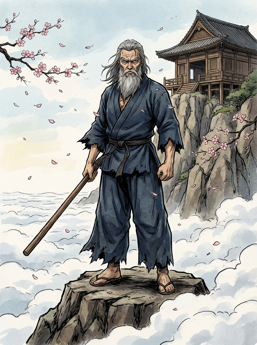 A wise, battle-hardened anime master standing atop a misty mountain, overlooking the world below. The model wears a rugged old master's gi with a long flowing beard and piercing eyes. The backdrop is an ancient dojo perched on a cliff, with floating petals caught in the wind. The style is in anime illustration.