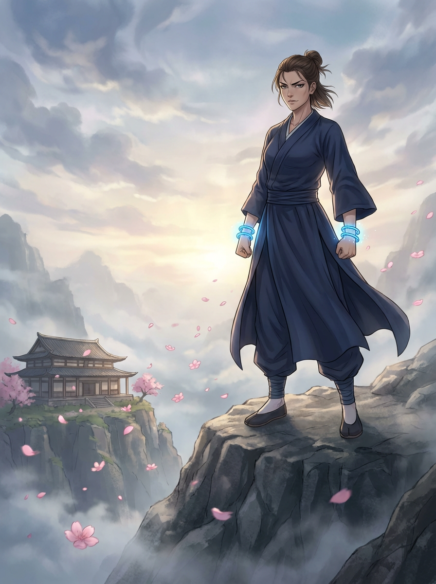 A wise, battle-hardened anime master standing atop a misty mountain, overlooking the world below. The model wears a flowing monk's robe with glowing enchanted bracelets . The backdrop is an ancient dojo perched on a cliff, with floating petals caught in the wind. The style is in anime illustration.