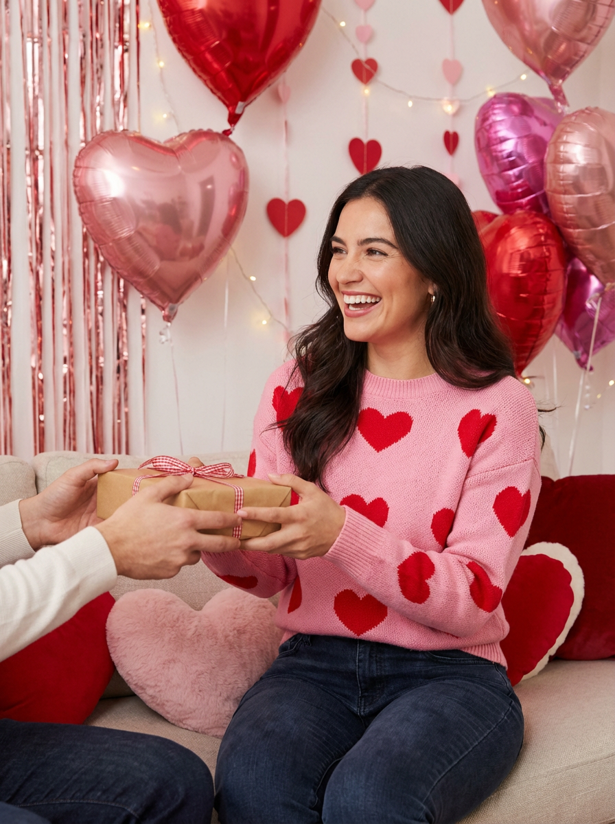 A model celebrating Valentine's Day, exchanging gifts and having fun in a cozy, heart-filled setting.