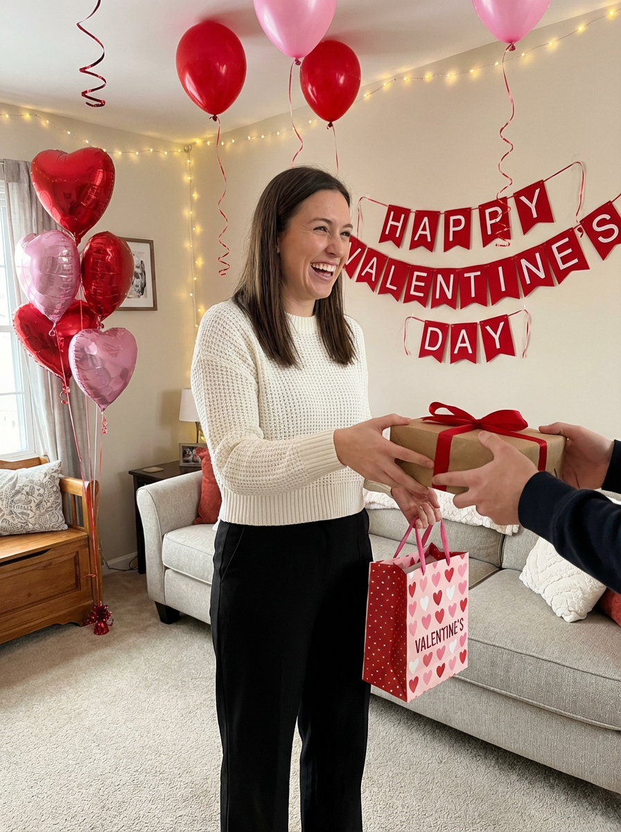 A model celebrating Valentine's Day, exchanging gifts and having fun in a cozy, heart-filled setting.