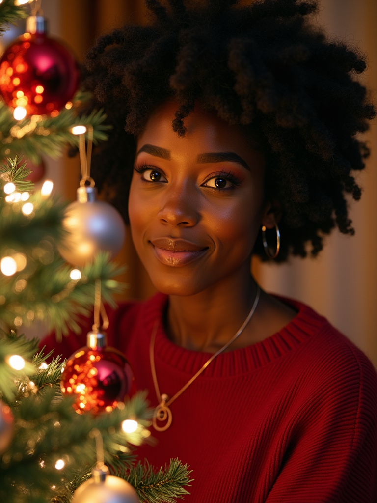 A model decorating a Christmas tree with colorful ornaments and tinsel, in a warm, festive setting.