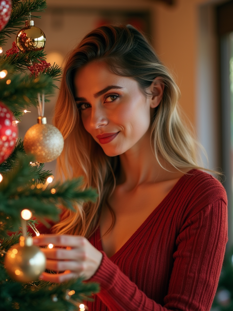 A model decorating a Christmas tree with colorful ornaments and tinsel, in a warm, festive setting.