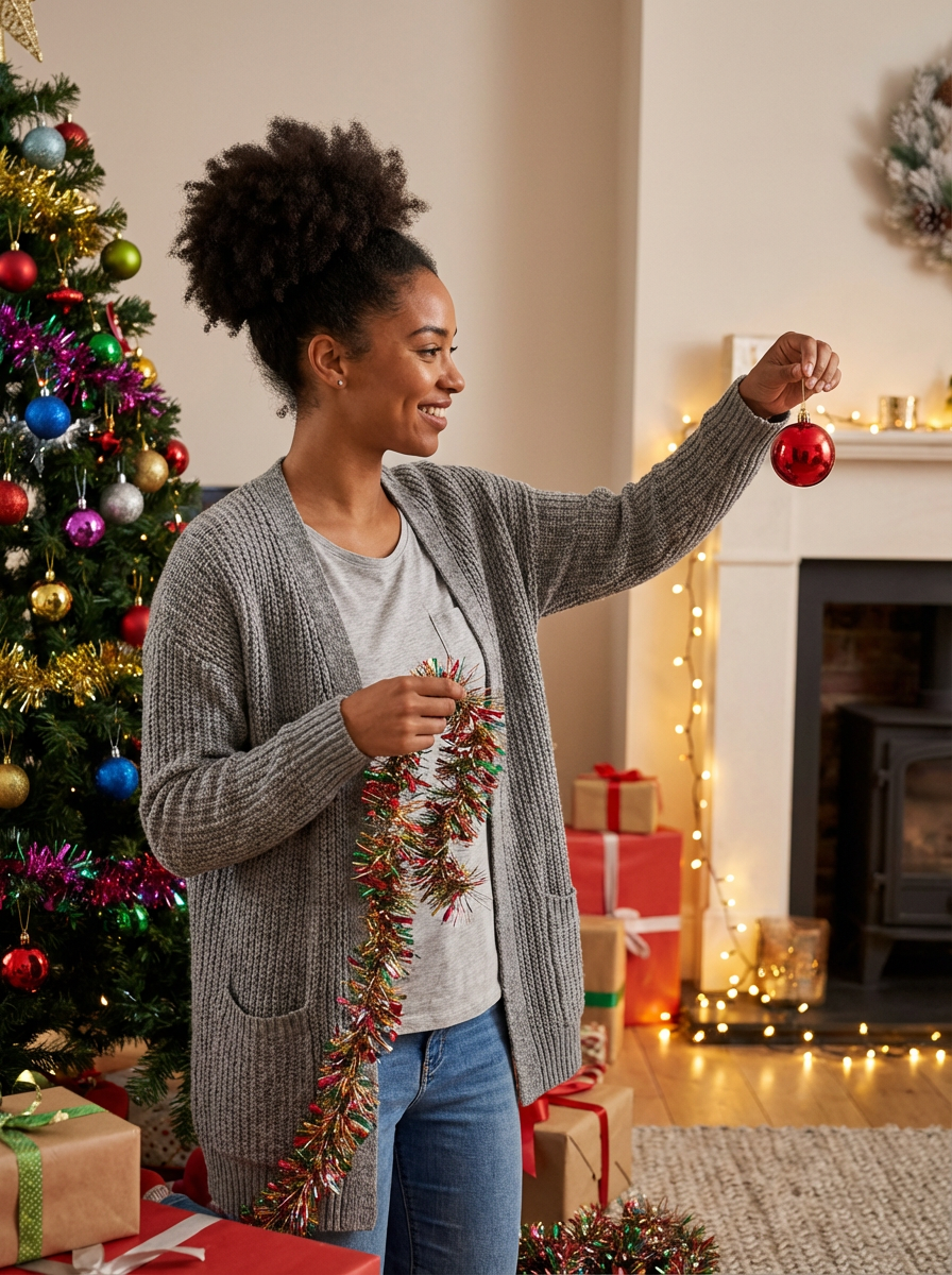 A model decorating a Christmas tree with colorful ornaments and tinsel, in a warm, festive setting.