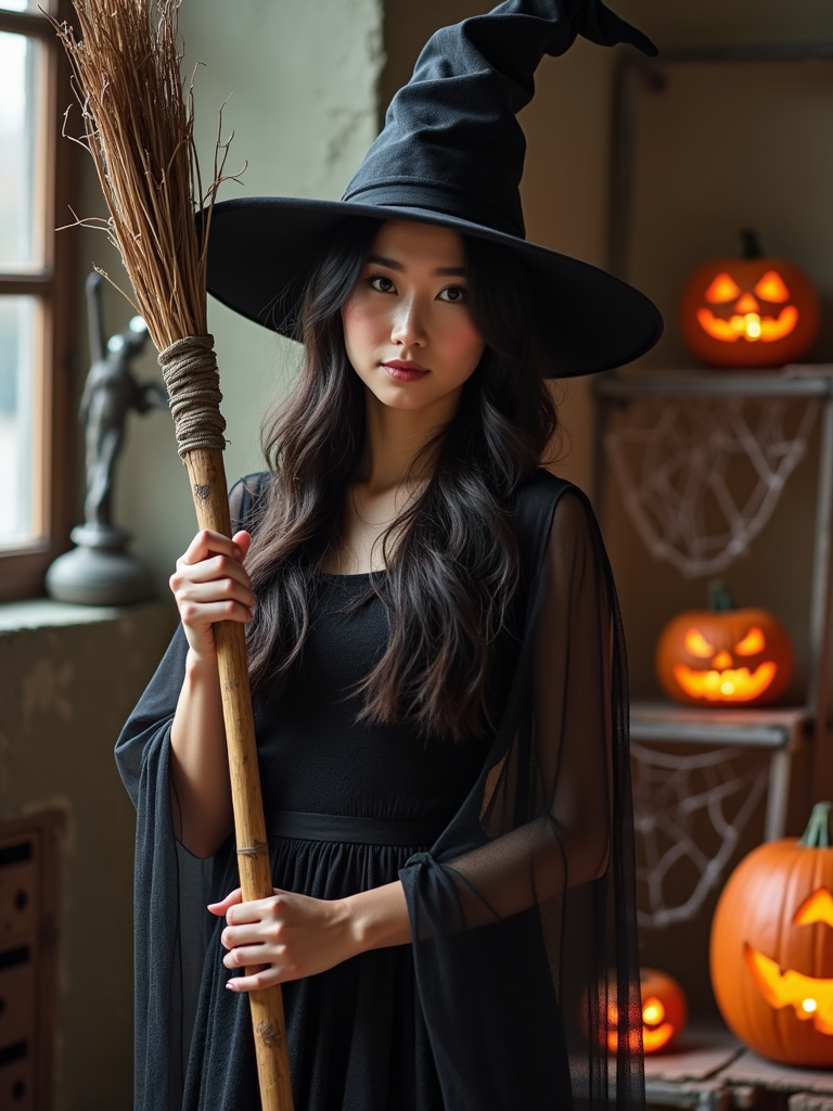 A model dressed as a friendly witch, wearing a pointed hat and holding a broomstick, surrounded by Halloween decorations like spider webs and glowing pumpkins.