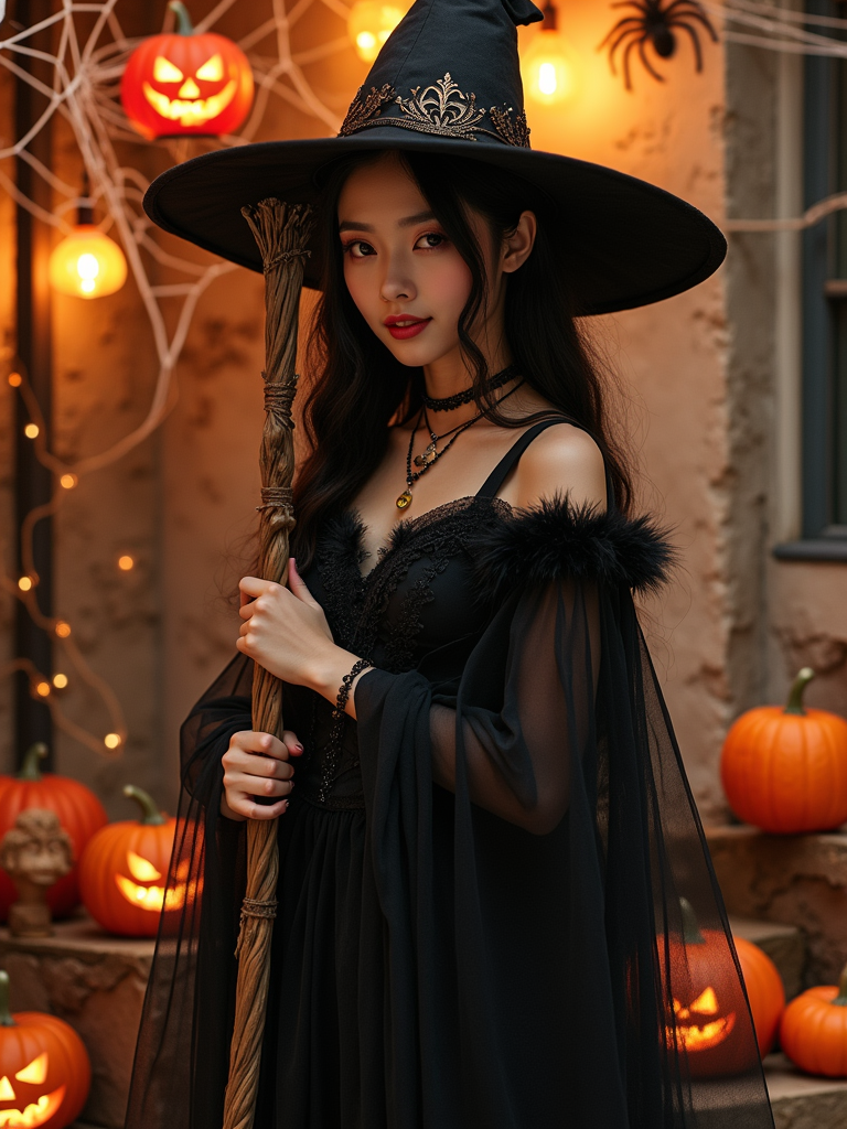 A model dressed as a friendly witch, wearing a pointed hat and holding a broomstick, surrounded by Halloween decorations like spider webs and glowing pumpkins.