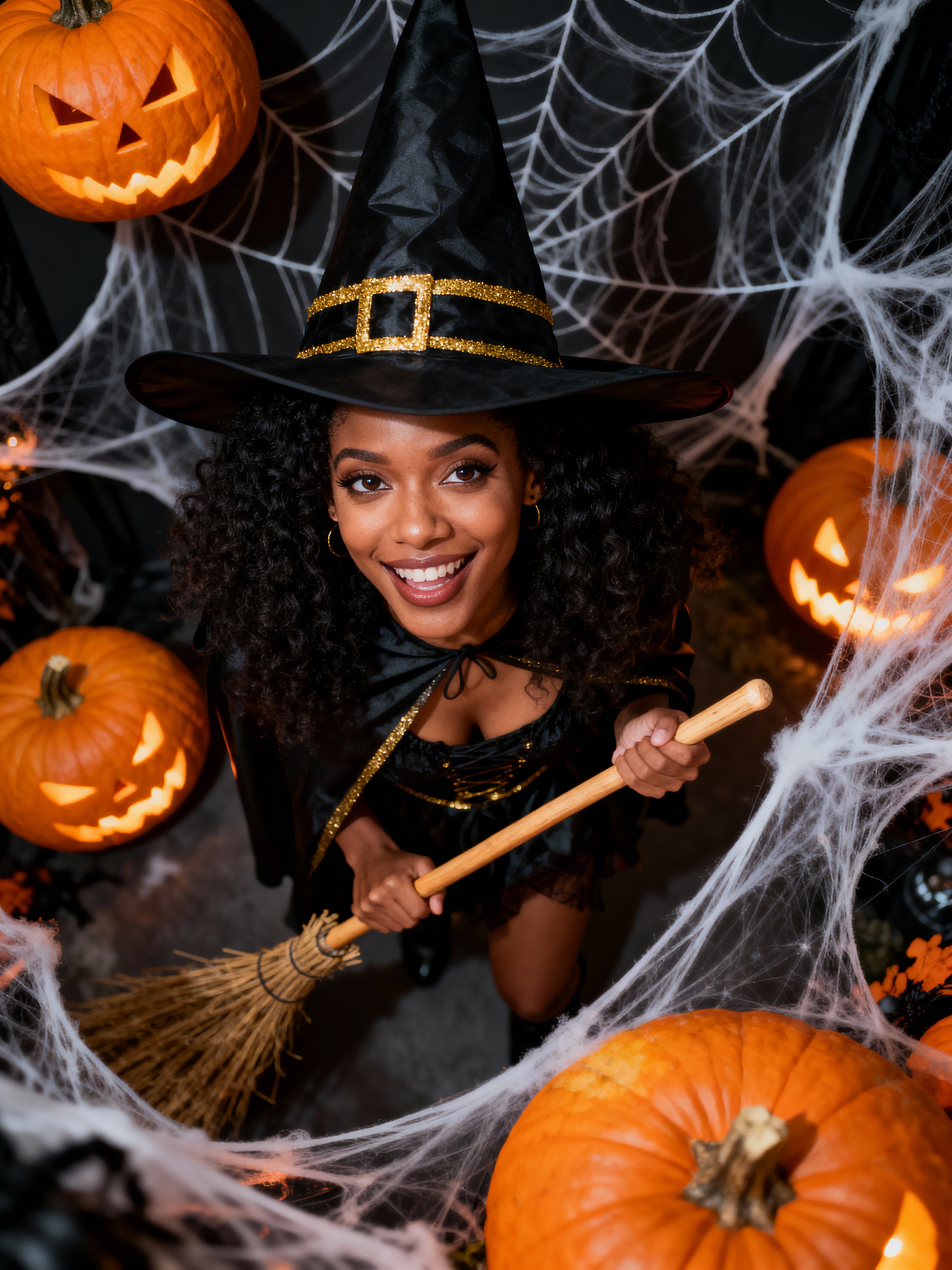 A model dressed as a friendly witch, wearing a pointed hat and holding a broomstick, surrounded by Halloween decorations like spider webs and glowing pumpkins.