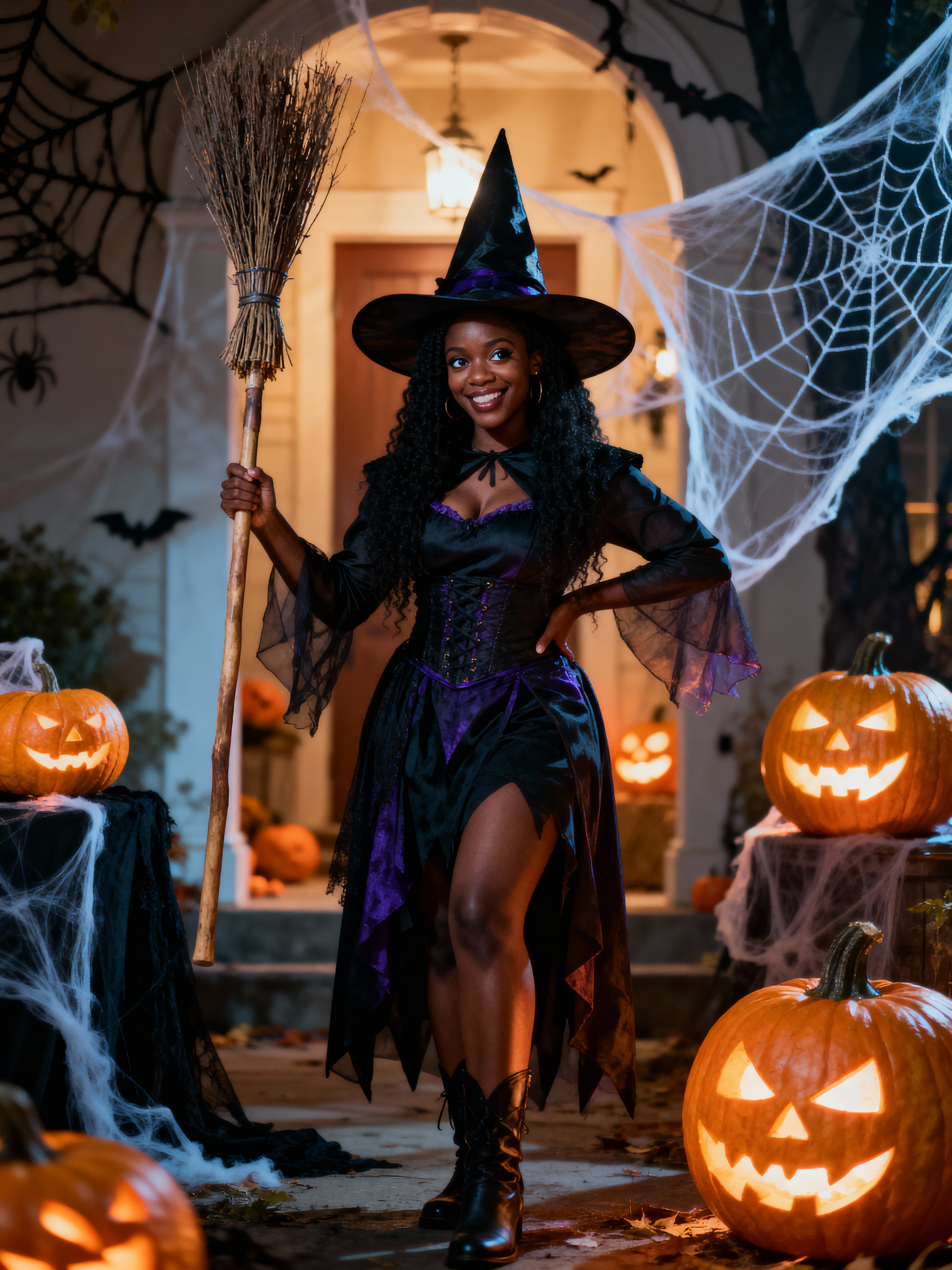 A model dressed as a friendly witch, wearing a pointed hat and holding a broomstick, surrounded by Halloween decorations like spider webs and glowing pumpkins.